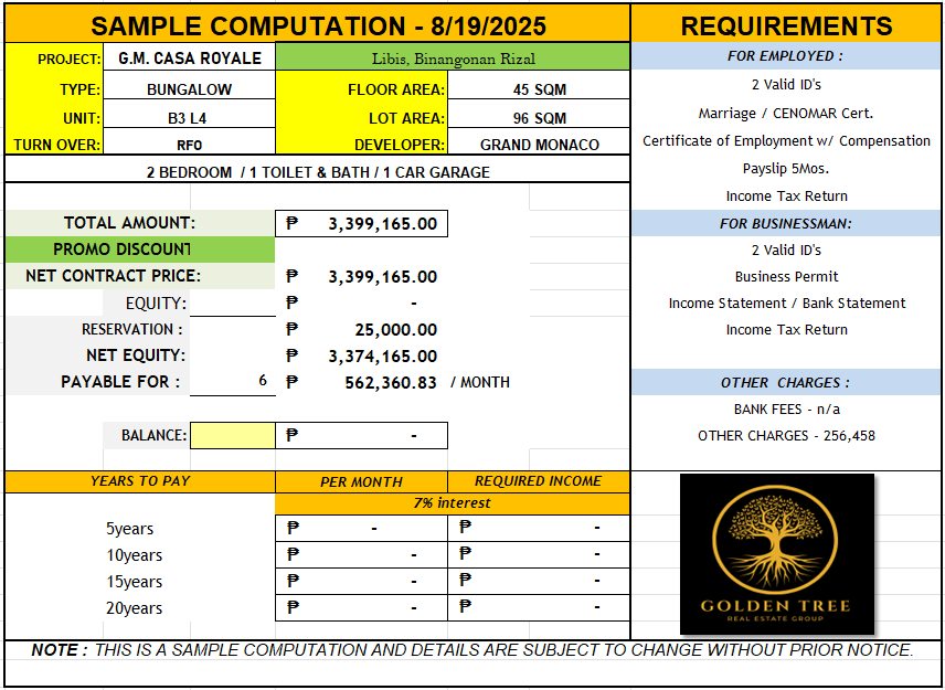 B3 L4 (Inner Bungalow) - Flr : 45sqm / Lot : 96sqm - 3,399,165